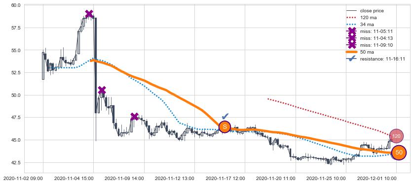 ⚄ 均线向上突破后价格围绕均线附近波动,并未远离均线,再次向下破位后维持原均线下跌趋势【极强】
