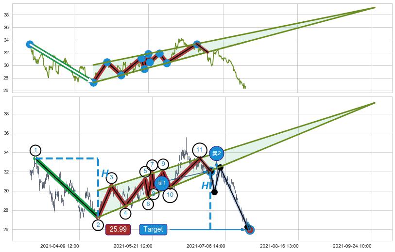 ➢ 最小中继整理跌幅→𝐇: 6.09 (𝐇楔型旗杆的长度:楔型起点→顶点)