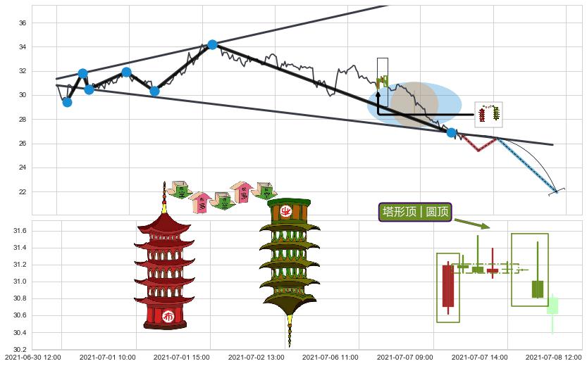 | 7 🅚:徐缓下降 ➕ 📐:扩散三角反转下行突破支撑位破位, 猜想持续下沉下跌,被突破的支撑位已变为阻力位 ☞ 看空信号 ⇥ 【🅚线】交织【图形】⇥ 综合量化分数: 37 | > |