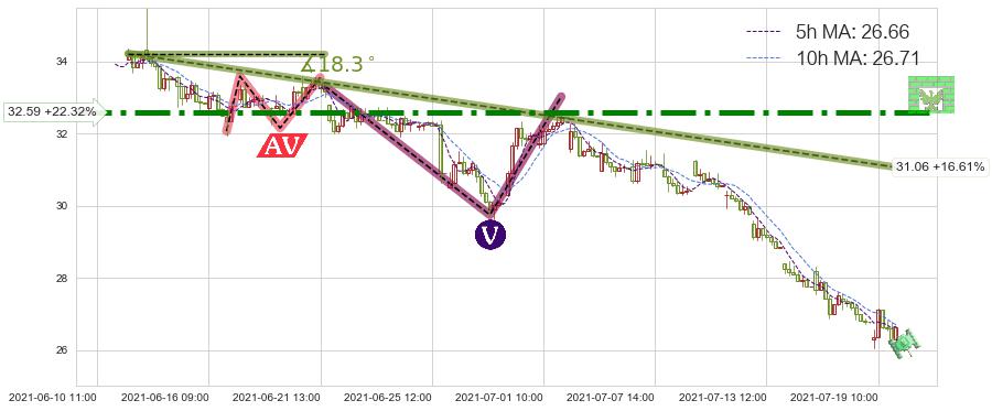 2021-06-22: 第一阻力位32.59强力阻拦了上升趋势,成功阻止了价格的继续上涨。
