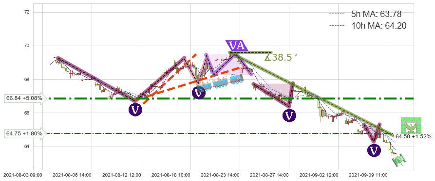 ♘ 在最后的下跌阶段2021-08-23 09:00至2021-09-09 15:00,存在 持续未破位的阻力位 ,阻力价格64.58,可信任强度76.36%,其距离最后价格63.61相差 +1.52%
