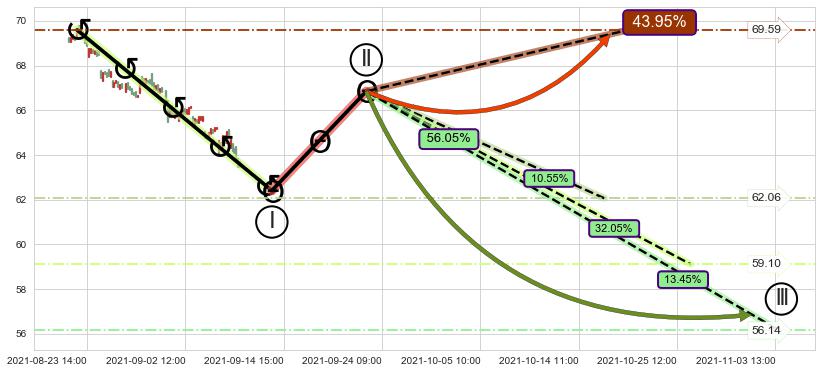 ➣ 5.1: 预测当前第5浪位置(09-09:14, 63.57),仍然有下跌空间