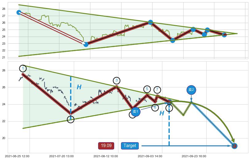 ➢ 最小中继整理跌幅→𝐇: 4.61 (𝐇楔型旗杆的长度:楔型起点→顶点)