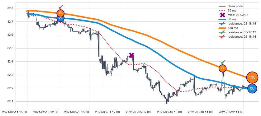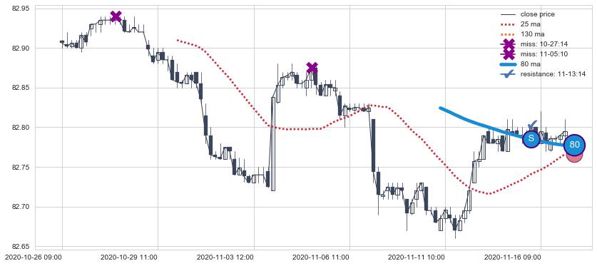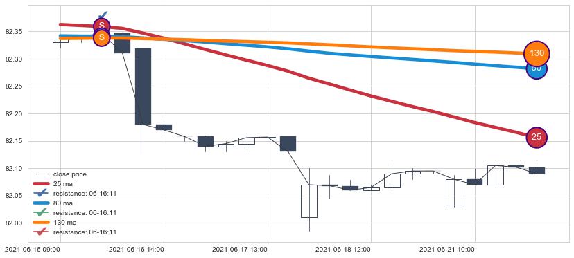 下跌趋势06-16 09:00-06-21 13:00,均线80, 25, 130确认关键阻力1处