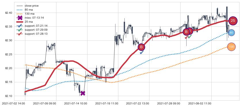 上涨趋势07-02 14:00-08-04 10:00,均线25确认关键支撑3处