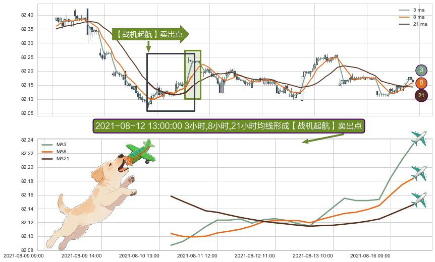 形态多维评估: ⚀ 2021-08-10 14:00:00小时-2021-08-16 11:00:00小时显现 3小时-8小时-21小时均线 【战机起航】卖出点 看空信号,后市看跌,卖出