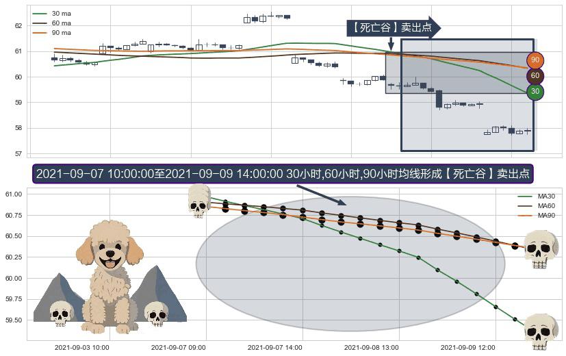 形态多维评估: ⚀ 2021-09-07 11:00:00-小时至2021-09-09 14:00:00-小时显现 30小时-60小时-90小时均线 【死亡谷】卖出点 看空信号,后市看跌,卖出
