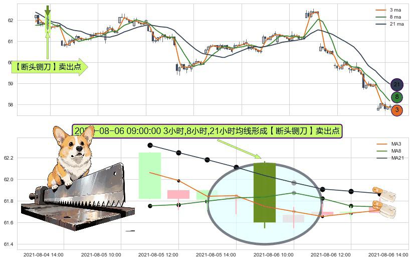 形态多维评估: ⚀ 2021-08-06 09:00:00小时显现 3小时-8小时-21小时均线 【断头铡刀】卖出点 看空信号,后市看跌,卖出
