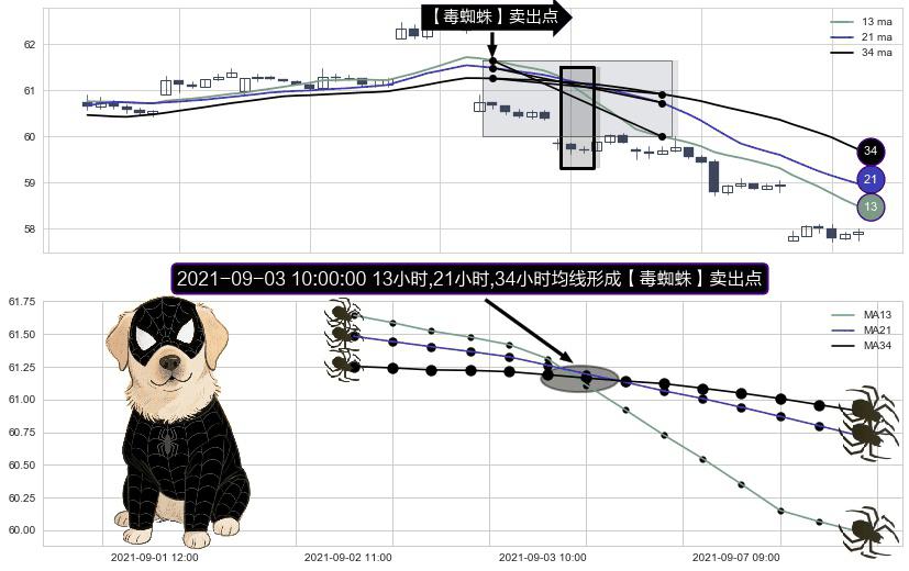 形态多维评估: ⚀ 2021-09-03 10:00:00小时显现 13小时-21小时-34小时均线 【毒蜘蛛】卖出点 看空信号,后市看跌,卖出
