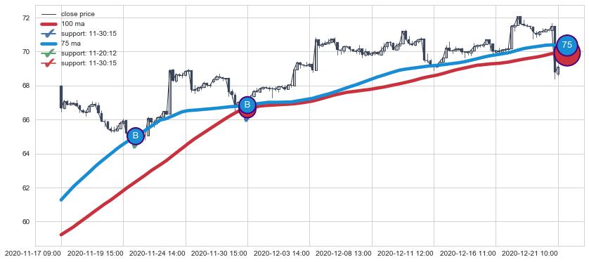 上涨趋势11-17 09:00-12-21 10:00,均线75, 100确认关键支撑2处