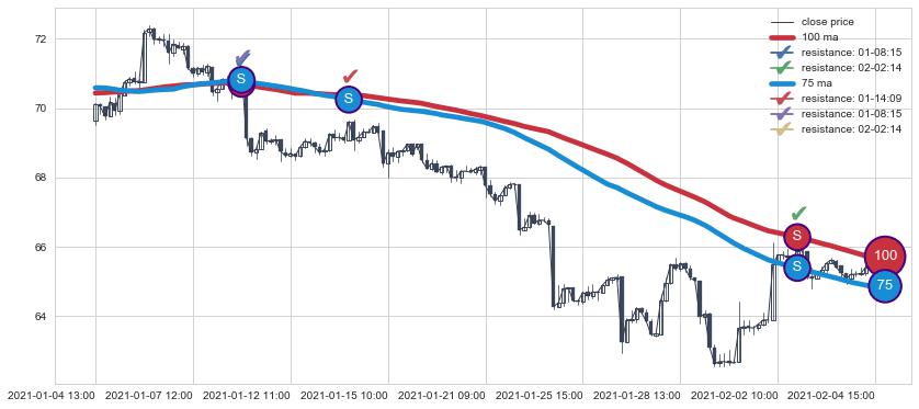 下跌趋势01-04 13:00-02-04 15:00,均线75, 100确认关键阻力3处