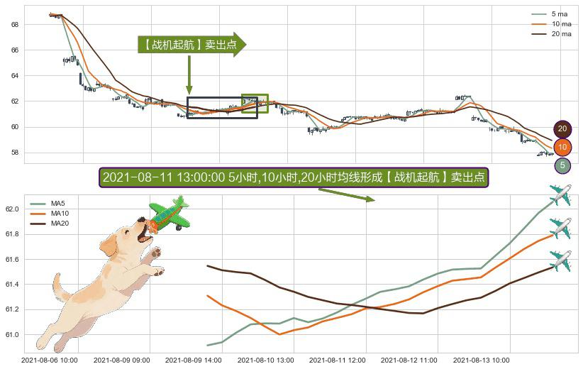 形态多维评估: ⚀ 2021-08-09 13:00:00小时-2021-08-13 13:00:00小时显现 5小时-10小时-20小时均线 【战机起航】卖出点 看空信号,后市看跌,卖出