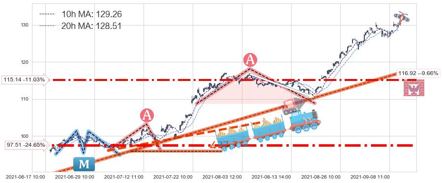 ♘ 在最后的上升阶段2021-06-18 09:00至2021-09-09 14:00存在 持续未破位的支撑位 ,支撑价格116.92,支撑可信任强度88.42%,其距离最后价格129.41相差 -9.66%