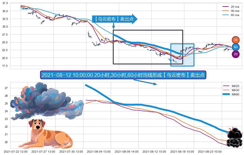 形态多维评估: ⚀ 2021-07-30 15:00:00小时-2021-08-24 11:00:00小时显现 20小时-30小时-60小时均线 【乌云密布】卖出点 看空信号,后市看跌,卖出