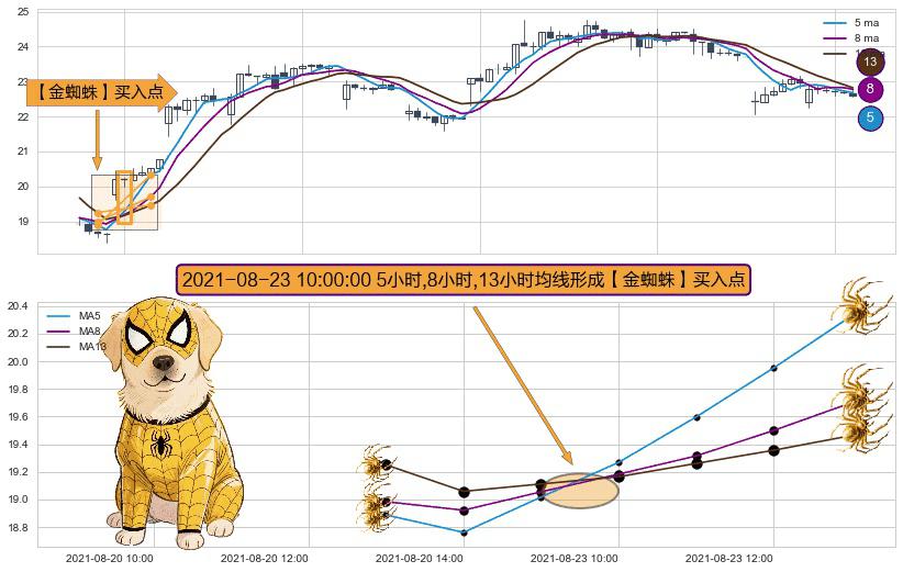 形态多维评估: ⚀ 2021-08-23 10:00:00小时显现 5小时-8小时-13小时均线 【金蜘蛛】买入点 看多信号,后市看涨,买入