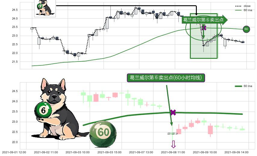 形态多维评估: ⚀ 2021-09-08 09:00:00-小时显现 葛兰威尔均线 60小时均线 第⑥卖出点 走势反转见顶信号,后市看跌,卖出信号