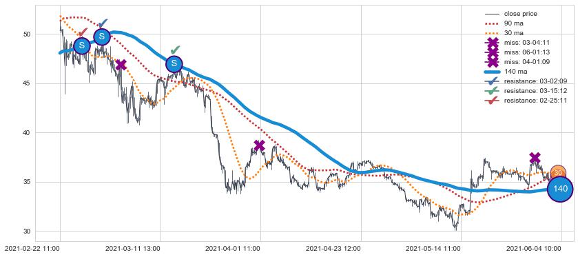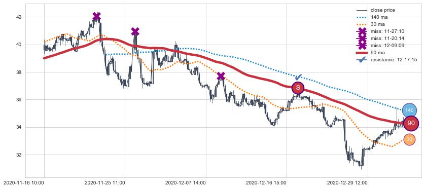 下跌趋势02-22 11:00-06-04 10:00,均线140确认关键阻力3处