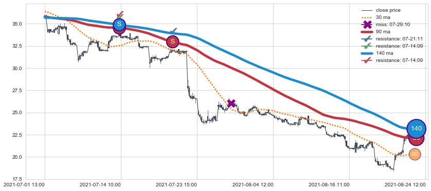 下跌趋势07-01 13:00-08-24 12:00,均线90, 140确认关键阻力2处