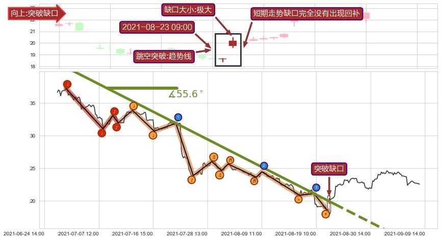 从2021-07-14 09:00至2021-08-23 14:00,共包含187个小时,阶段股价下跌-45.91%,阶段股价变动位移路程比: 1 : 3,下跌趋势角度: 55.3