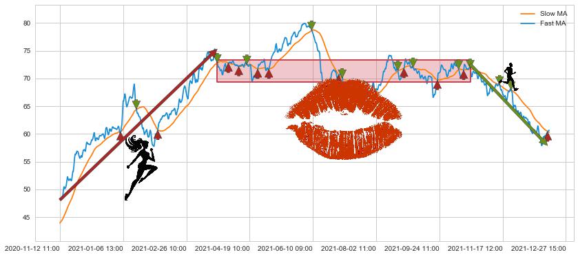 ⚅ 卖点向下突破均线后,价格走势很纠结,不断在均线周围试探,有再次上探突破均线的可能