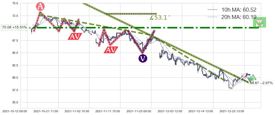 从2021-10-15 10:00至2021-12-21 11:00,共包含314个小时,阶段股价下跌-19.06%,阶段股价变动位移路程比: 1 : 7,下跌趋势角度: 53.1