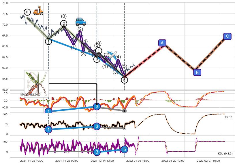 ➣ 1,3,5驱动浪MACD, RSI, KDJ走势都出现【常规背离】反转信号增强