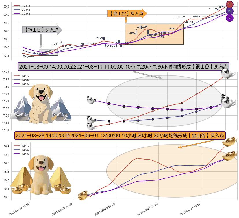 ⚀ 2021-08-24 09:00:00-小时至2021-09-01 13:00:00-小时显现 10小时-20小时-30小时均线 【金山谷】买入点 其再次确认了买入信号,可靠性更强,买入