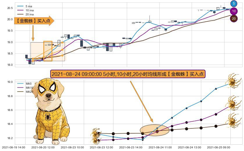 ⚀ 2021-08-24 09:00:00小时显现 5小时-10小时-20小时均线 【金蜘蛛】买入点 看多信号,后市看涨,买入
