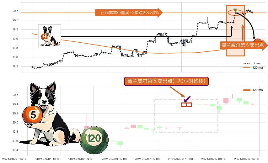 ⚀ 2021-09-08 09:00:00-小时显现 葛兰威尔均线 120小时均线 第⑤卖出点 上升趋势均值回复的短线回落信号,后市看跌,卖出信号