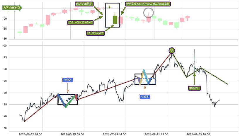 从2021-08-25 13:00至2021-09-09 14:00,共包含62个小时,阶段股价下跌-17.85%,阶段股价变动位移路程比: 1 : 2,2021-09-02 09:00向↘︎形成缺口,跳空下跌-9.46%˚
