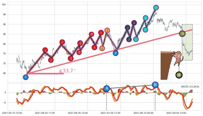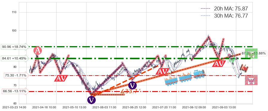 ➣ 2021-05-13 12:00-2021-08-20 13:00上升趋势存在反转[风险],其原上升趋势的支撑位(87.23)已破位[强阻力信号],原上升趋势角度: 33.7˚