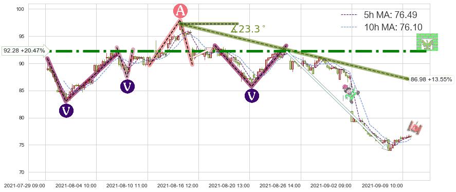 2021-08-05: 第一阻力位92.28强力阻拦了上升趋势,成功阻止了价格的继续上涨。