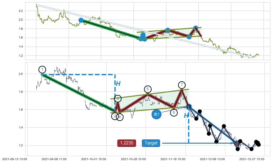 从2021-12-22 10:00至2021-12-27 15:00,共包含20个小时,阶段股价上涨4.41%,阶段股价变动位移路程比: 1 : 3