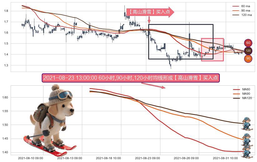 形态多维评估: ⚀ 2021-08-13 13:00:00小时-2021-08-31 13:00:00小时显现 60小时-90小时-120小时均线 【高山滑雪】买入点 看多信号,后市看涨,买入