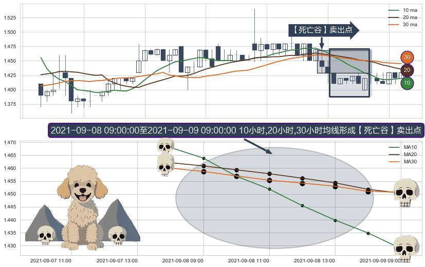 形态多维评估: ⚀ 2021-09-08 10:00:00-小时至2021-09-09 09:00:00-小时显现 10小时-20小时-30小时均线 【死亡谷】卖出点 看空信号,后市看跌,卖出