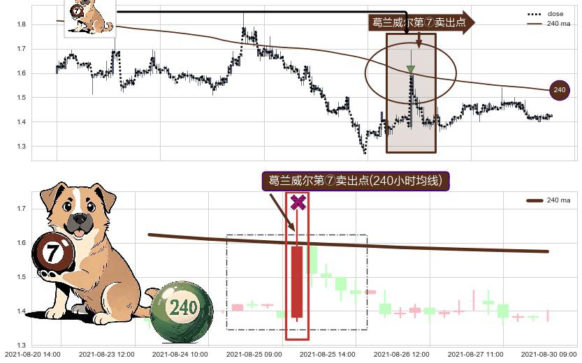 形态多维评估: ⚀ 2021-08-25 10:00:00-小时显现 葛兰威尔均线 240小时均线 第⑦卖出点 下降趋势的中继信号,后市看跌,卖出信号