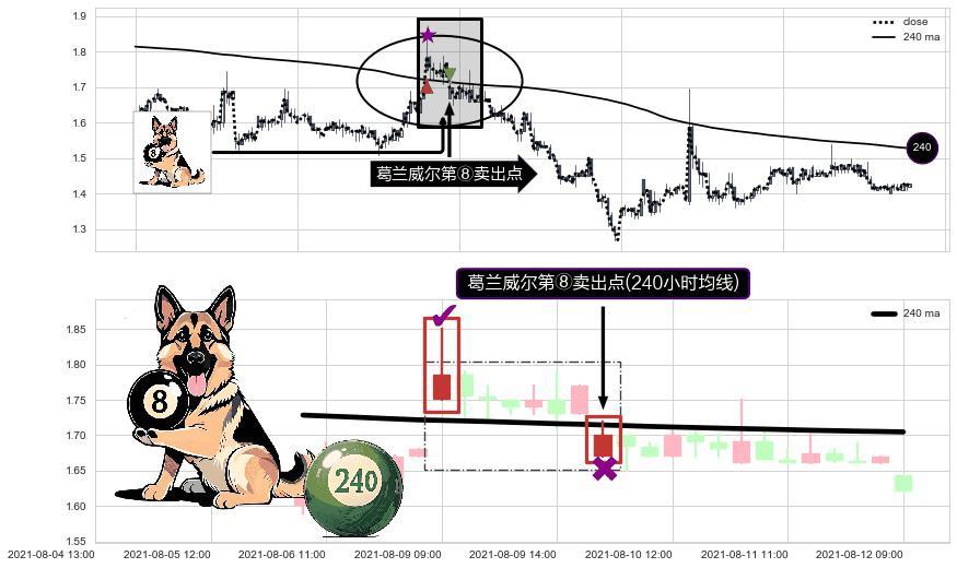 形态多维评估: ⚀ 2021-08-10 09:00:00-小时显现 葛兰威尔均线 240小时均线 第⑧卖出点 下降趋势的中继信号,后市看跌,卖出信号
