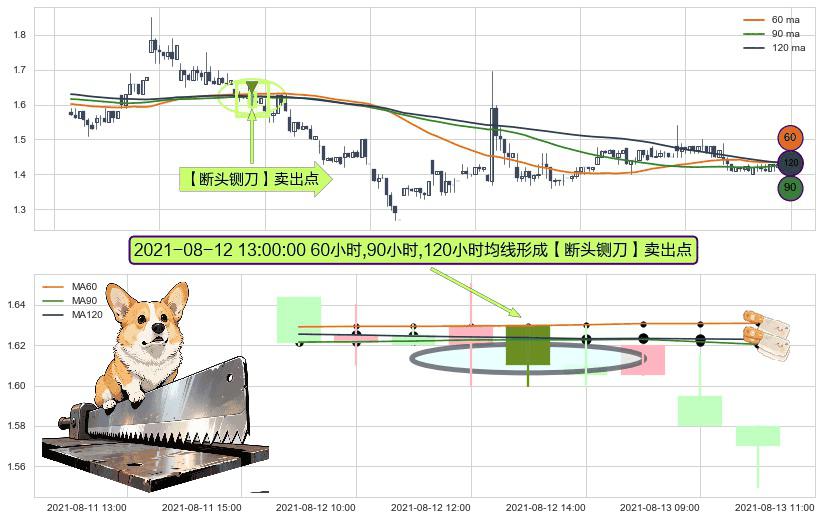 形态多维评估: ⚀ 2021-08-12 13:00:00小时显现 60小时-90小时-120小时均线 【断头铡刀】卖出点 看空信号,后市看跌,卖出