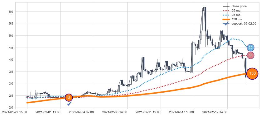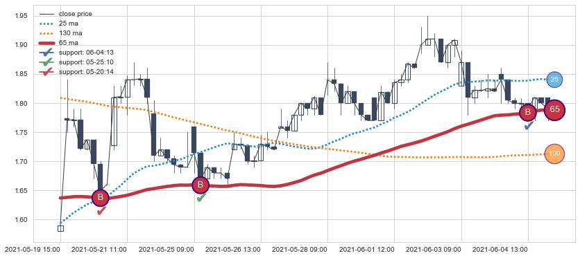 上涨趋势05-19 15:00-06-07 09:00,均线65确认关键支撑3处