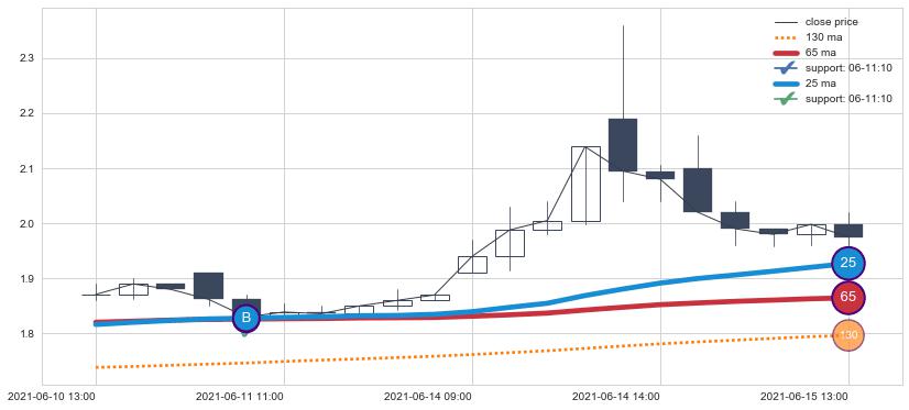 上涨趋势06-10 13:00-06-15 13:00,均线65, 25确认关键支撑1处