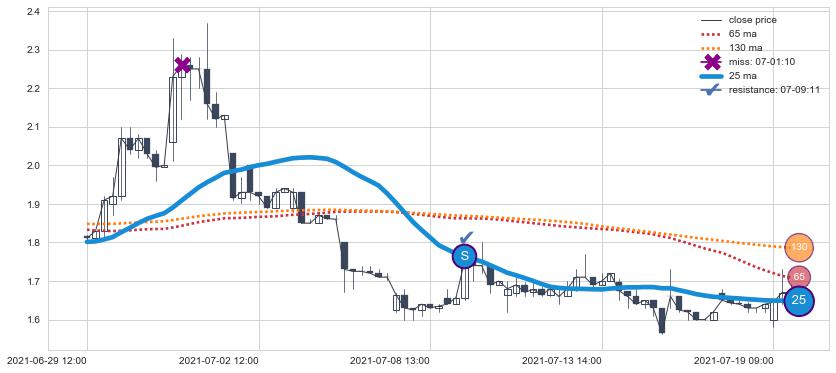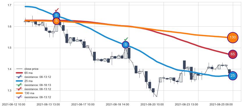 下跌趋势08-12 10:00-08-25 09:00,均线65, 130, 25确认关键阻力2处