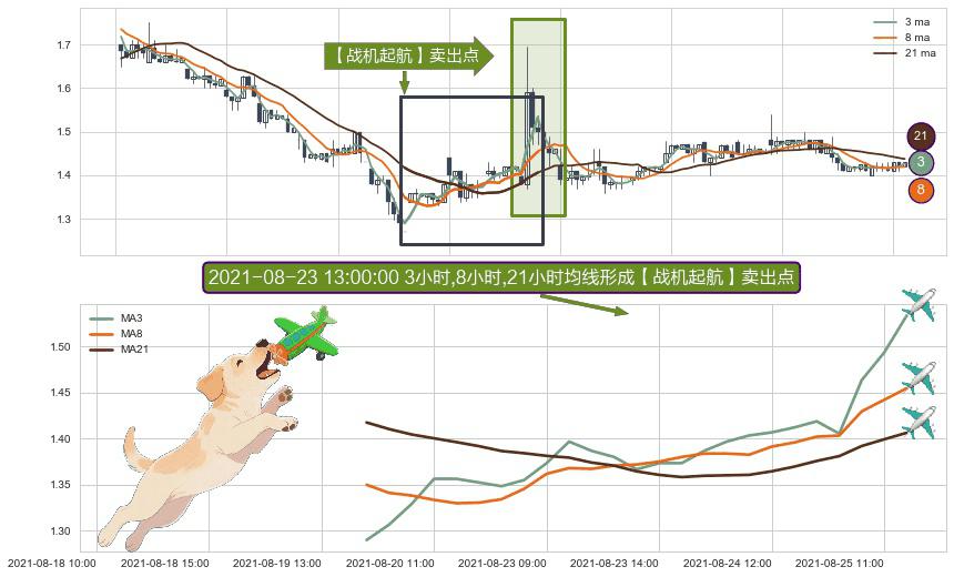 形态多维评估: ⚀ 2021-08-19 15:00:00小时-2021-08-25 12:00:00小时显现 3小时-8小时-21小时均线 【战机起航】卖出点 看空信号,后市看跌,卖出