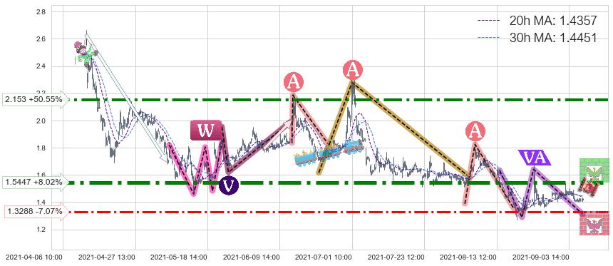 ♘ 阻力价格位2.153,可信任强度77.39%,距离最后交易2021-09-09 15:00形成的收盘价格1.4300相差 +50.55%