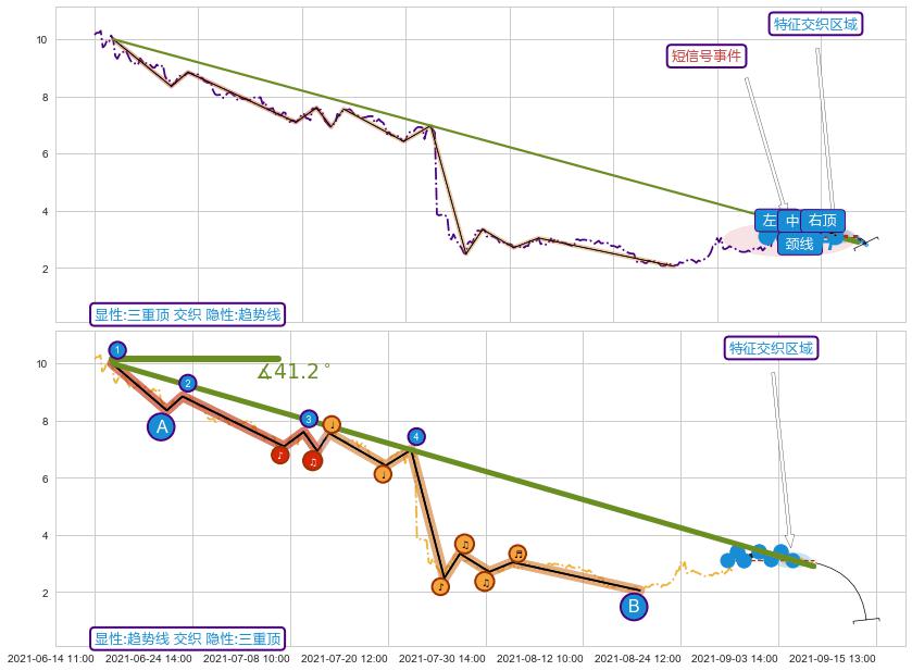 | 3 🅚:下跌抵抗 ➕ 📐:三重顶下行突破支撑位破位, 猜想持续下沉下跌,被突破的支撑位已变为阻力位 ☞ 看空信号 ⇥ 【🅚线】交织【图形】⇥ 综合量化分数: 49 | > |