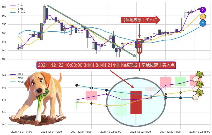 形态多维评估: ⚀ 2021-12-22 10:00:00小时显现 3小时-8小时-21小时均线 【旱地拔葱】买入点 看多信号,后市看涨,买入