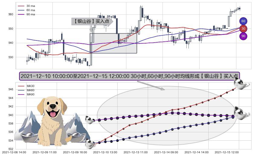形态多维评估: ⚀ 2021-12-10 11:00:00-小时至2021-12-15 12:00:00-小时显现 30小时-60小时-90小时均线 【银山谷】买入点 看多信号,后市看涨,买入
