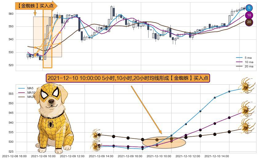 形态多维评估: ⚀ 2021-12-10 10:00:00小时显现 5小时-10小时-20小时均线 【金蜘蛛】买入点 看多信号,后市看涨,买入