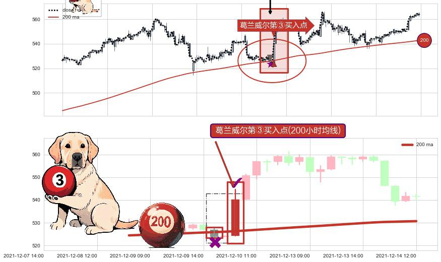 形态多维评估: ⚀ 2021-12-10 09:00:00-小时显现 葛兰威尔均线 200小时均线 第③买入点 上升趋势的中继信号,后市看涨,买进信号