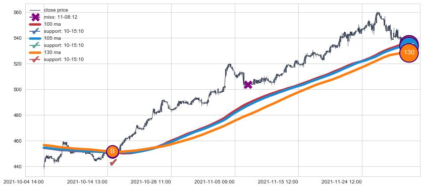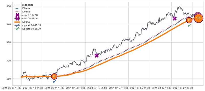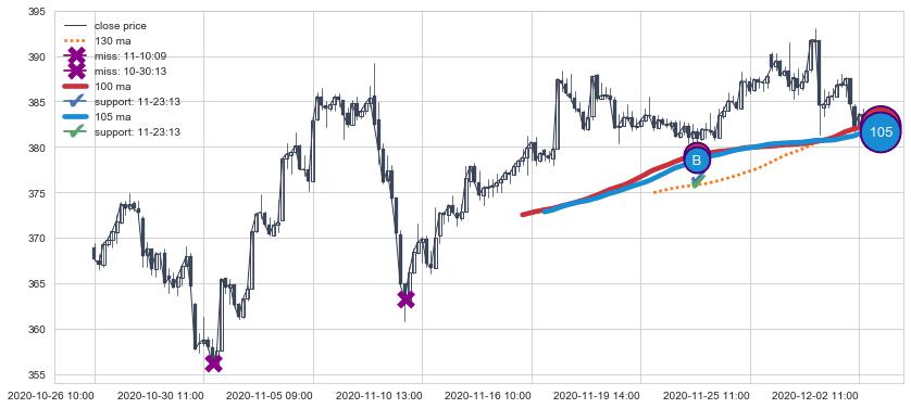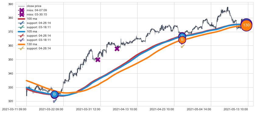 上涨趋势03-11 09:00-05-13 10:00,均线105, 130, 100确认关键支撑2处