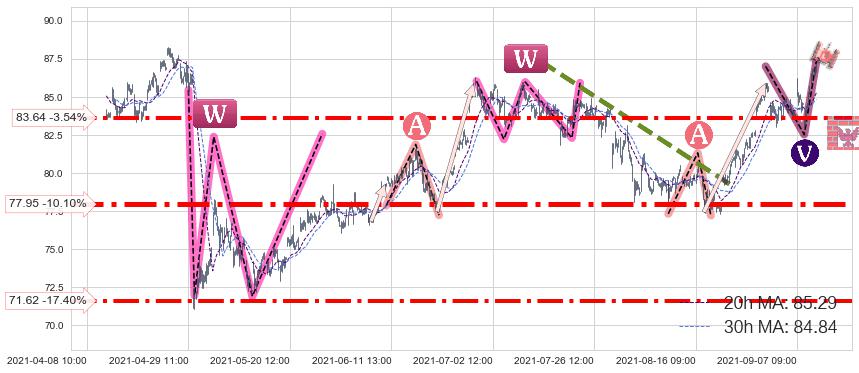 ➢ 【仅预测突破】最后价格:86.71与预测突破价格:85.47→【空间较大】后续最小【整理】第一目标价格→(09-21:13: 78.28 )